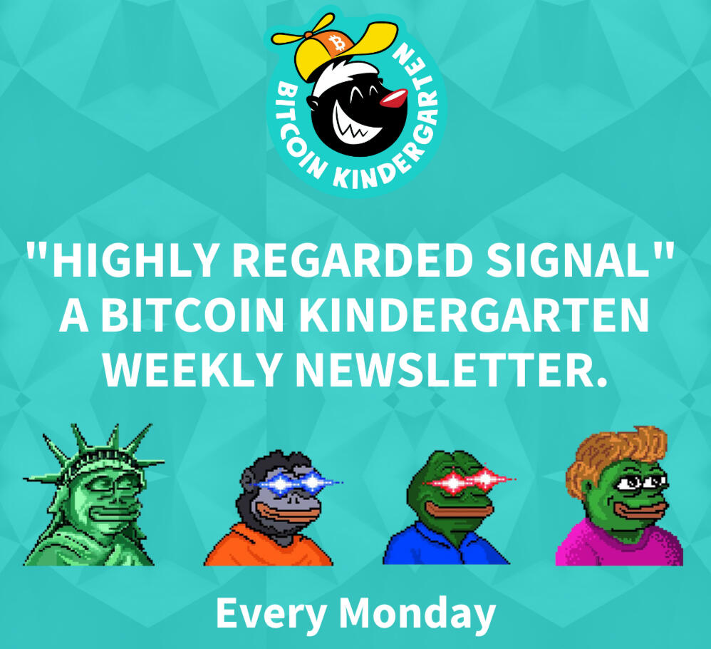 One housekeeping note: if our welcome email ended up in a spam, promotion, or social folder, please move it to your primary folder! On Gmail, you can do this by clicking the three dots in the top right corner of this email, selecting “move”, and clicking on “primary”. Thank you!We'll keep you posted on Bitcoin Kindergarten curated content featuring...memes, plebs, merch drops and other signal.